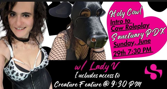 The class also discusses the different types of dynamics involved in cow-centric pet play. Top, bottom, switch, hucow, bull, ox, farmer, butcher, or just curious, this class is for you! Join us, chew the cud, & love your cow. Built-in mind to be inclusive of any gender identity. Be seen and also herd.